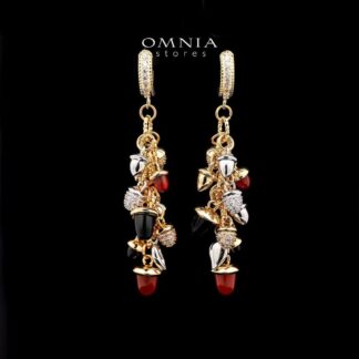 Omnia Sienna Black Agate and Red Agate Charm Dangle Earrings with Zircon Accents in Brass with Gold Plated Finish