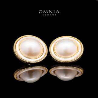Omnia Leona White Mabel Pearl Classic Stud Earrings with Textured Beaded Frame in Brass with Gold Plated Finish
