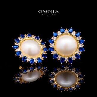 Omnia Celeste White Mabel Pearl Halo Stud Earrings with Blue Sapphire Accents in Brass with Gold Plated Finish