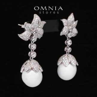 Omnia Iyana White Floral Fresh Real Pearl Drop Earrings With High Quality Simulated Diamonds in 925 Silver