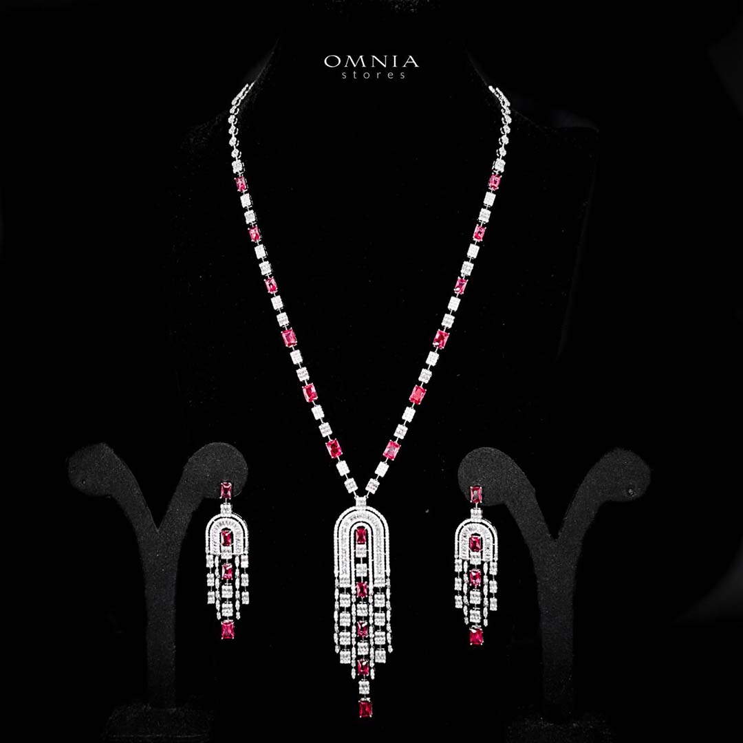 Omnia Jane White Bridal Set in Rhodium Plated Finish with High-Quality Red Zircon Stones – Bold Romance for Your Bridal Moment