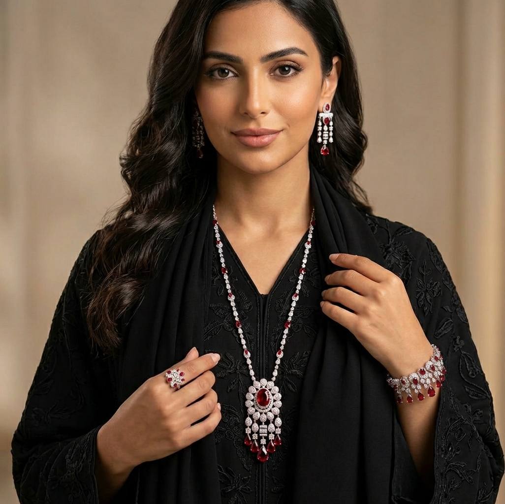 The Aleya Red Full Set is a masterwork of high-jewelry design. This comprehensive collection—featuring a Grand Multi-Tiered Long Chain Necklace, Matching Statement Earrings, a Luxury Bracelet, and a Signature Ring—is meticulously pavé-set with High-Quality Simulated Diamonds and vibrant Red focal stones. Forged in 925 Sterling Silver and finished in platinum-standard Rhodium, the Aleya Red provides a “Wall of Light” effect infused with the warmth of royal crimson.