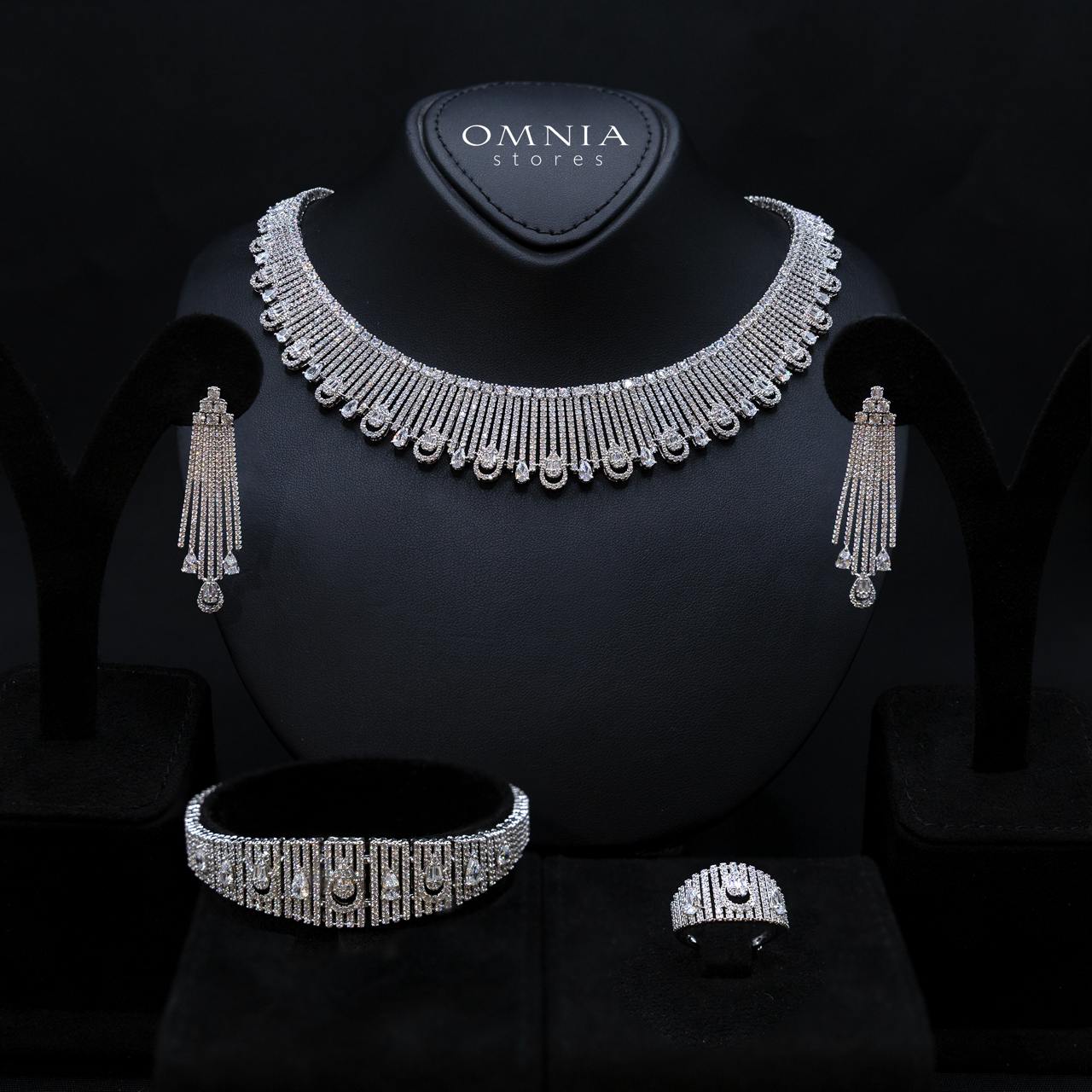 - Linear Chandelier Design: The Fahma set features a grand bib necklace with alternating linear drops, each finished with a brilliant-cut zircon accent. This architectural design provides full, shimmering coverage that draws the eye and highlights the neckline with regal poise.