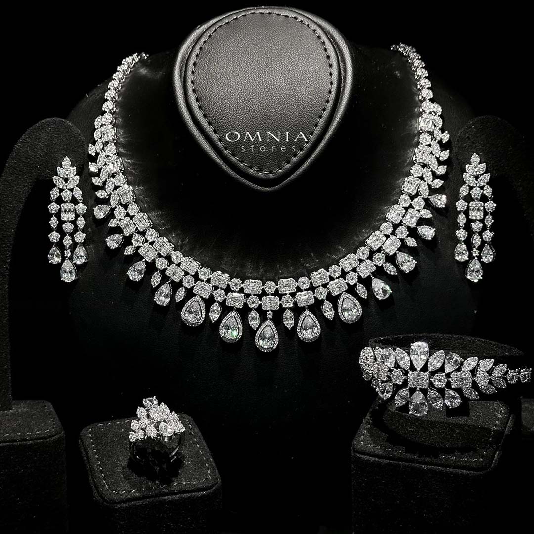 The Omnia Adelita Bridal Full Set offers brides a stunning set of accessories featuring high-quality zircon stones and rhodium plating. This complete set includes a necklace, earrings, ring, and bracelet, designed to enhance your wedding day style with timeless beauty. Hypoallergenic and tarnish-free, it ensures lasting comfort and elegance. Find this set exclusively at Omnia Stores.
