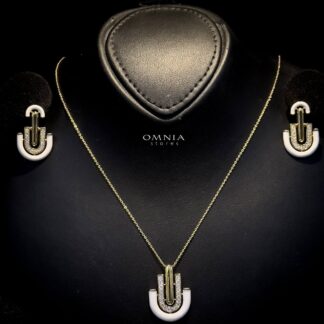 The set includes a beautifully designed necklace, matching earrings, and complementary bridal accessories, all arranged to highlight the rich gold accents paired with sparkling zircon stones. The Omnia Alaia set is perfect for brides seeking a majestic, luxurious, and unforgettable look on their special day.
