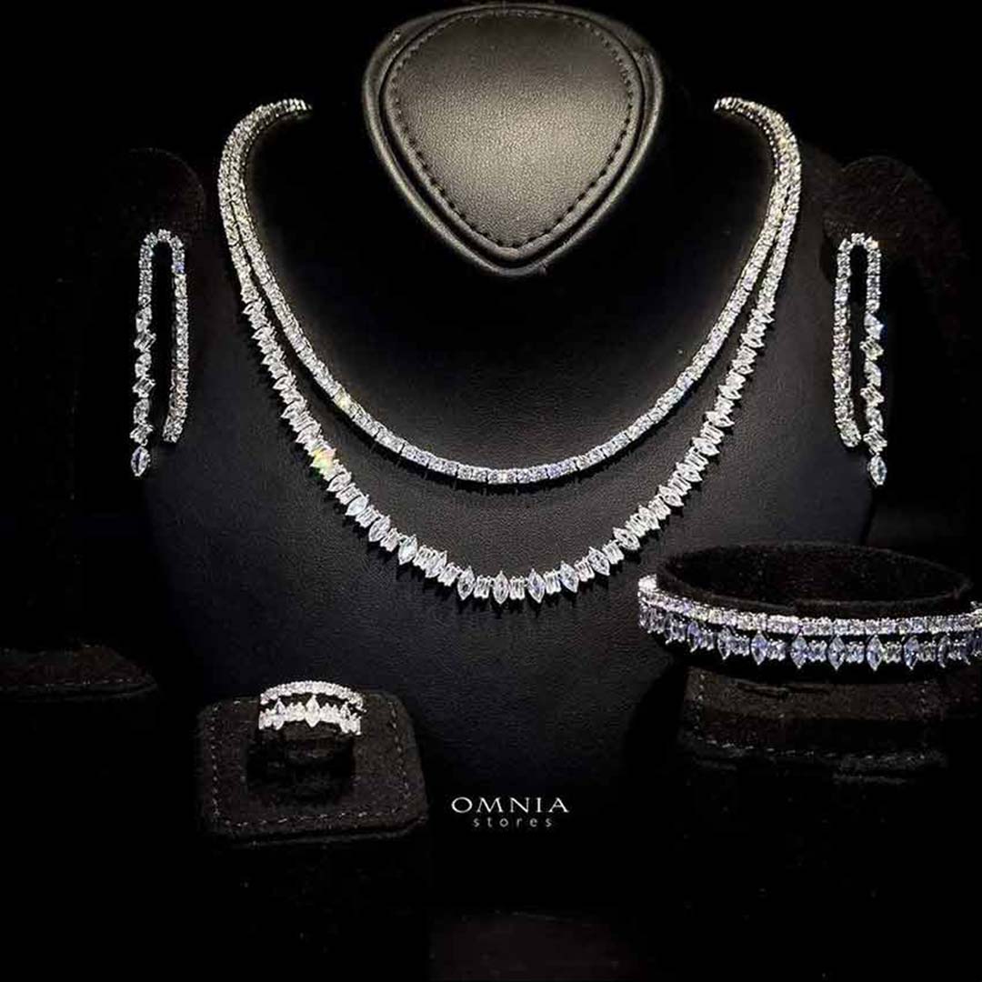 The elegant set Omnia Alica White Bridal Full Set is now available at Omnia Stores. This lovely bridal jewelry includes a gorgeous double chain shiny necklace, a ring, a pair of earrings and bracelet. The charming bridal full set is made of high-quality shiny white zircon stones and glittering rhodium-plated. This beautiful complete bridal set is suitable for classic and contemporary weddings, especially for brides who want to look even more elegant and shining. Buy this pretty bridal set on Omnia Stores and on this website.