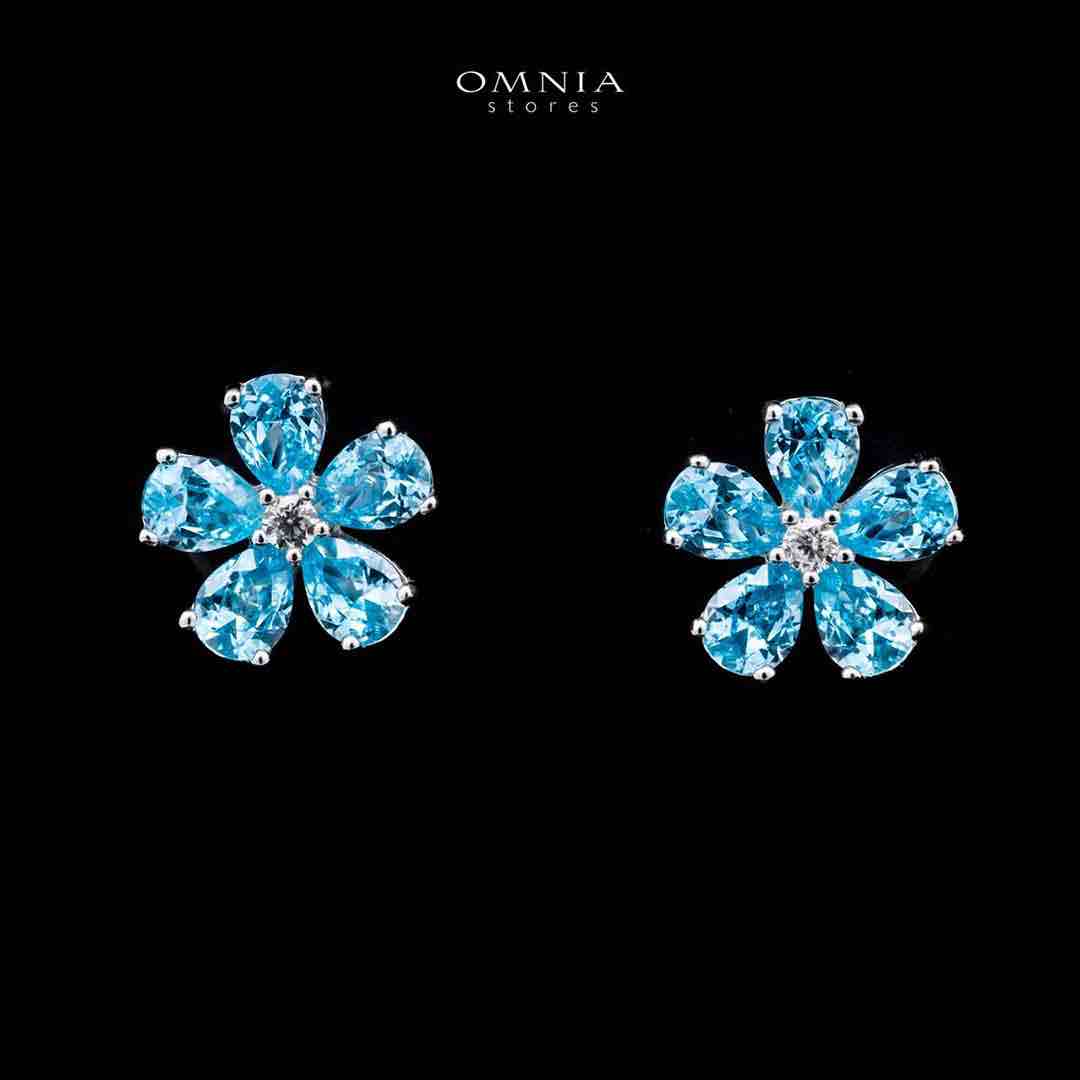 Omnia Aqua Flower Stud Earrings In 92.5 Silver with High Quality Simulated Diamonds