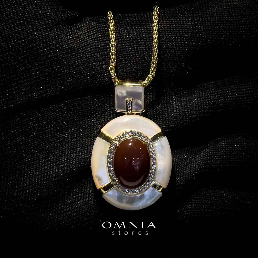 Omnia Ayesha Pendant Necklace in Brass Gold Plated with White Shell & Red Agate