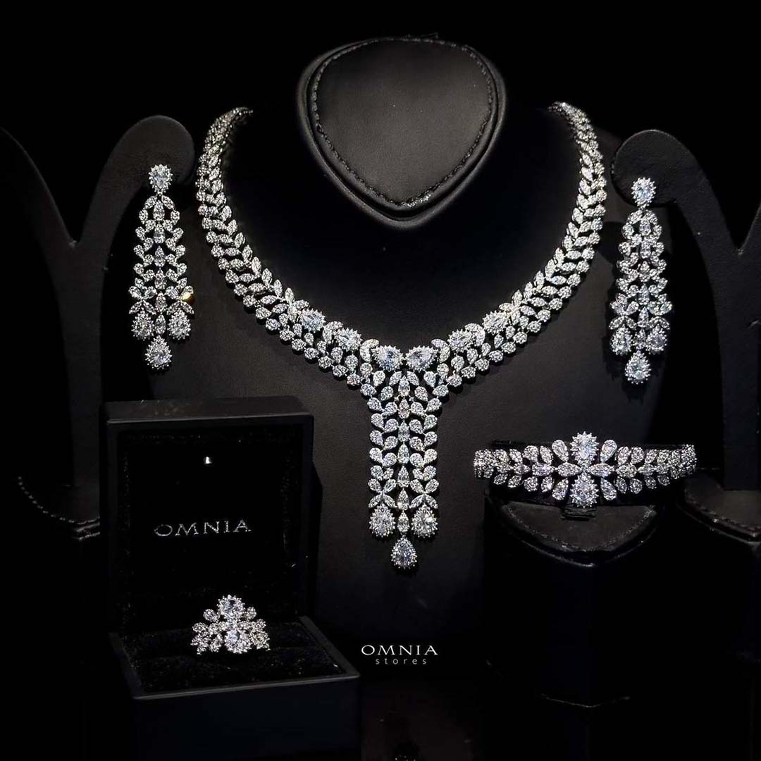 The Omnia Bushra Bridal Full Set is a beautifully crafted collection featuring high-quality zircon stones with a rhodium-plated finish. This set includes a necklace, earrings, ring, and bracelet, ensuring a coordinated and elegant look for brides. Hypoallergenic and designed to resist tarnishing, it promises long-lasting comfort and beauty. Ideal for brides seeking a timeless and stylish accessory set for their wedding day. Available exclusively at Omnia Stores.