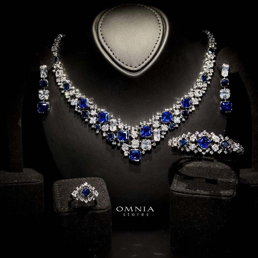 The Omnia Catherine Blue Bridal Full Set brings elegance and beauty to your wedding day. This set includes a necklace, earrings, ring, and bracelet, all adorned with high-quality zircon stones and rhodium plating for long-lasting shine. Hypoallergenic and tarnish-free, it ensures comfort while adding a classic, elegant touch to your bridal look. Available exclusively at Omnia Stores.