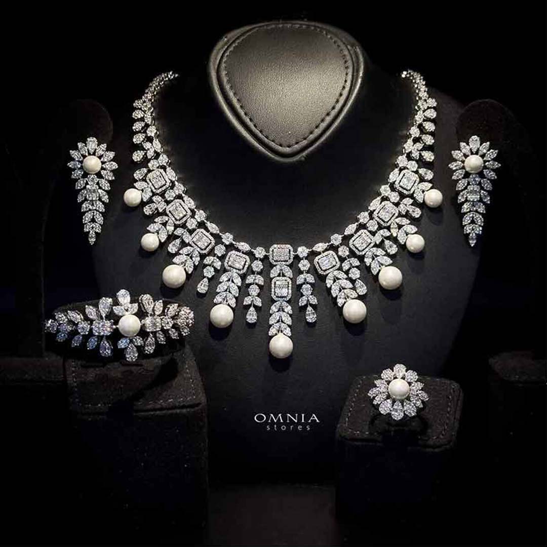 The Omnia Dalimah White Bridal Full Set from Omnia Stores is a stunning choice for brides. This bridal jewelry set includes a necklace, ring, earrings, and bracelet, all made from high-quality white zircon stones and coated with rhodium plating for a long-lasting shine. The timeless design of this set makes it perfect for any bride who loves classic bridal necklace set designs. Enhance your bridal look with this beautiful jewelry set, available only at Omnia Stores.