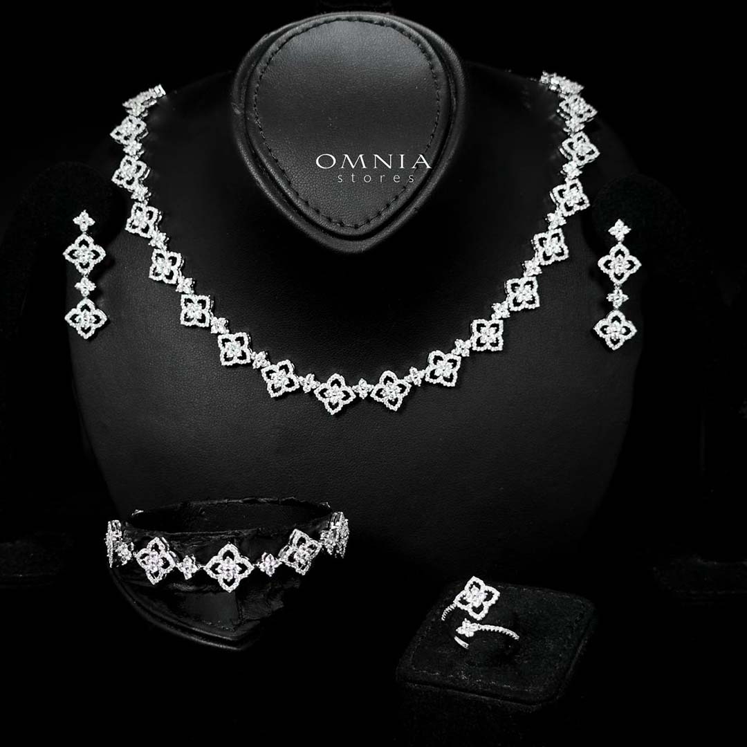 Step into your forever moment with the refined beauty of the Omnia Daniah White Bridal Full Set — a graceful 4-piece ensemble that includes a statement necklace, shimmering drop earrings, a polished bracelet, and a coordinating ring. Designed with high-quality zircon stones and finished in rhodium plating, this set is a flawless expression of modern bridal elegance.