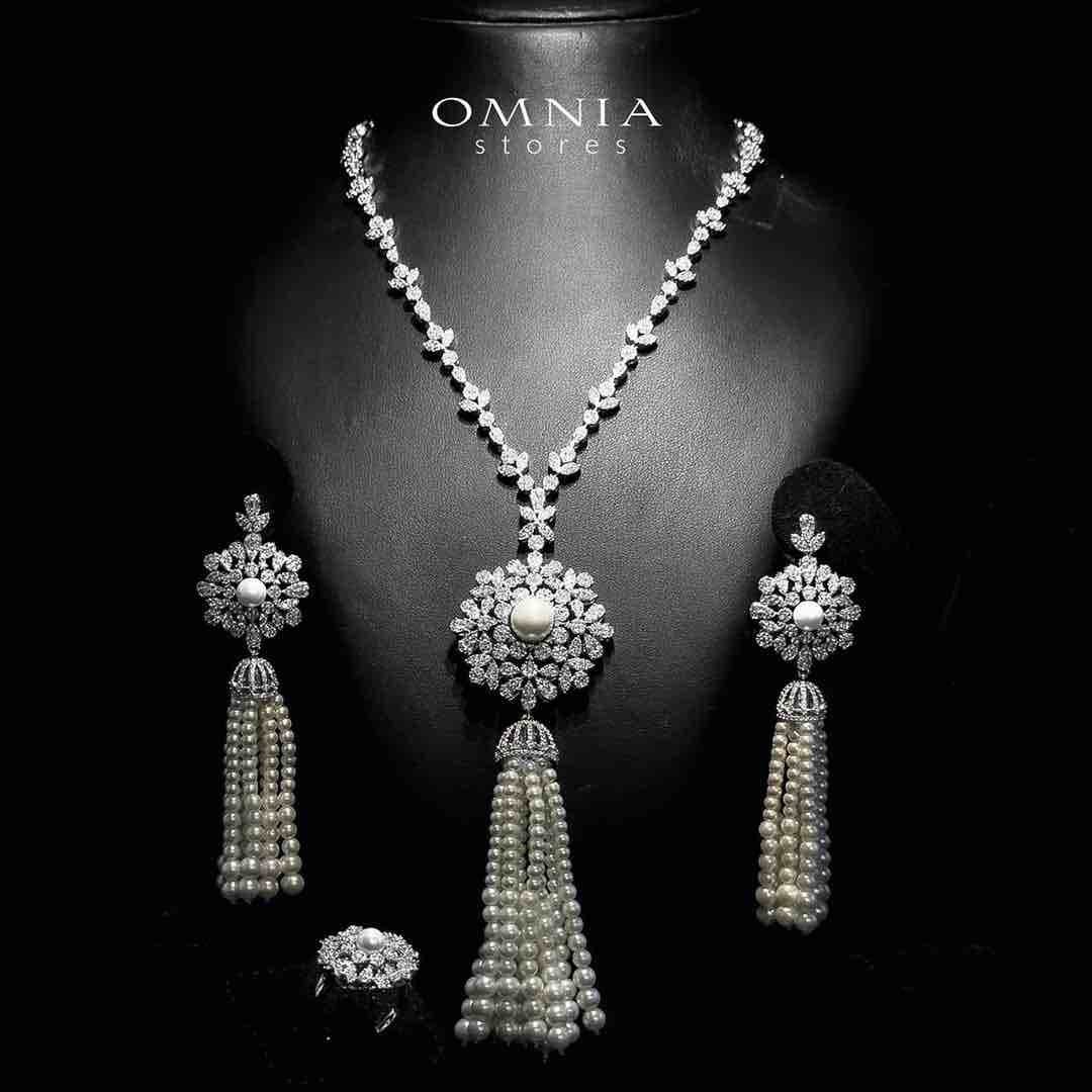Elevate your bridal ensemble with the Omnia Delaram White Full Set, a stunning jewelry collection crafted for timeless sophistication. This elegant long chain necklace set features radiant high-quality zircon stones paired with delicate pearls, all set in a rhodium-plated finish for a luxurious shine that resists tarnish.
