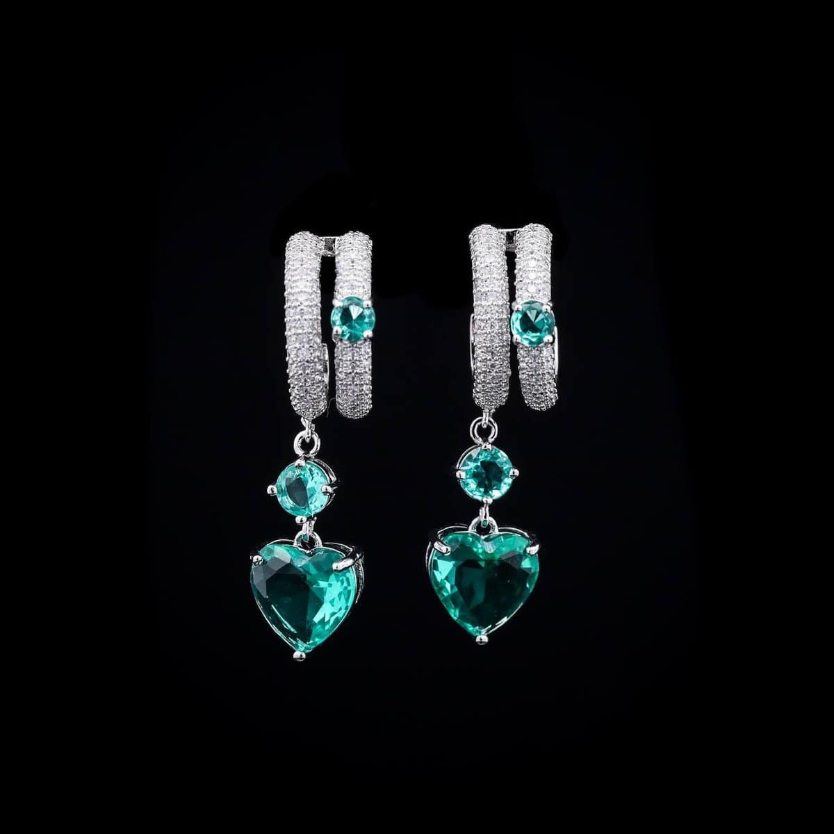 Omnia Emerald Heart Drop Earrings in High-Quality Green Zircon Stone with Double Hoop Design in Rhodium Plated