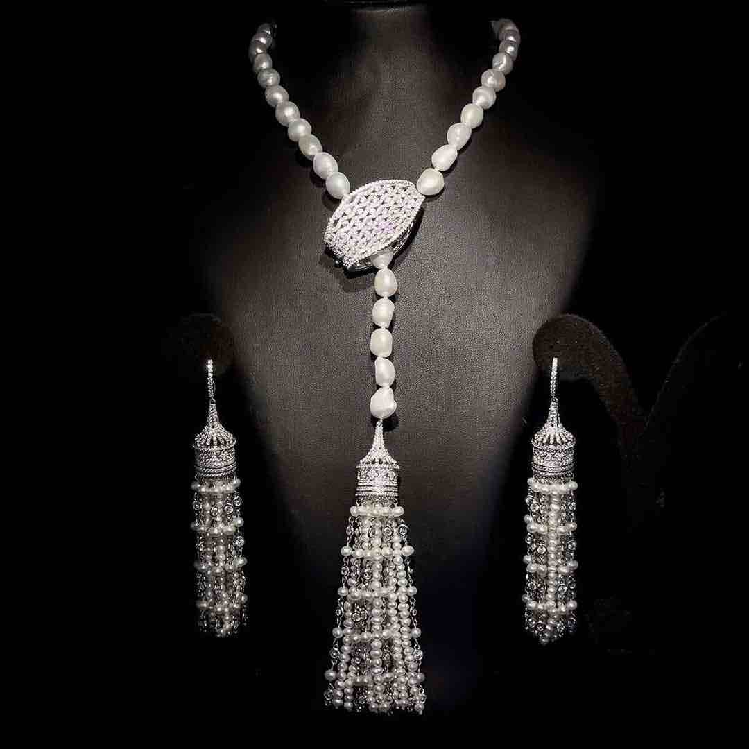 - Set of High Quality 92.5 Silver Pearl Long chain & Drop Earrings