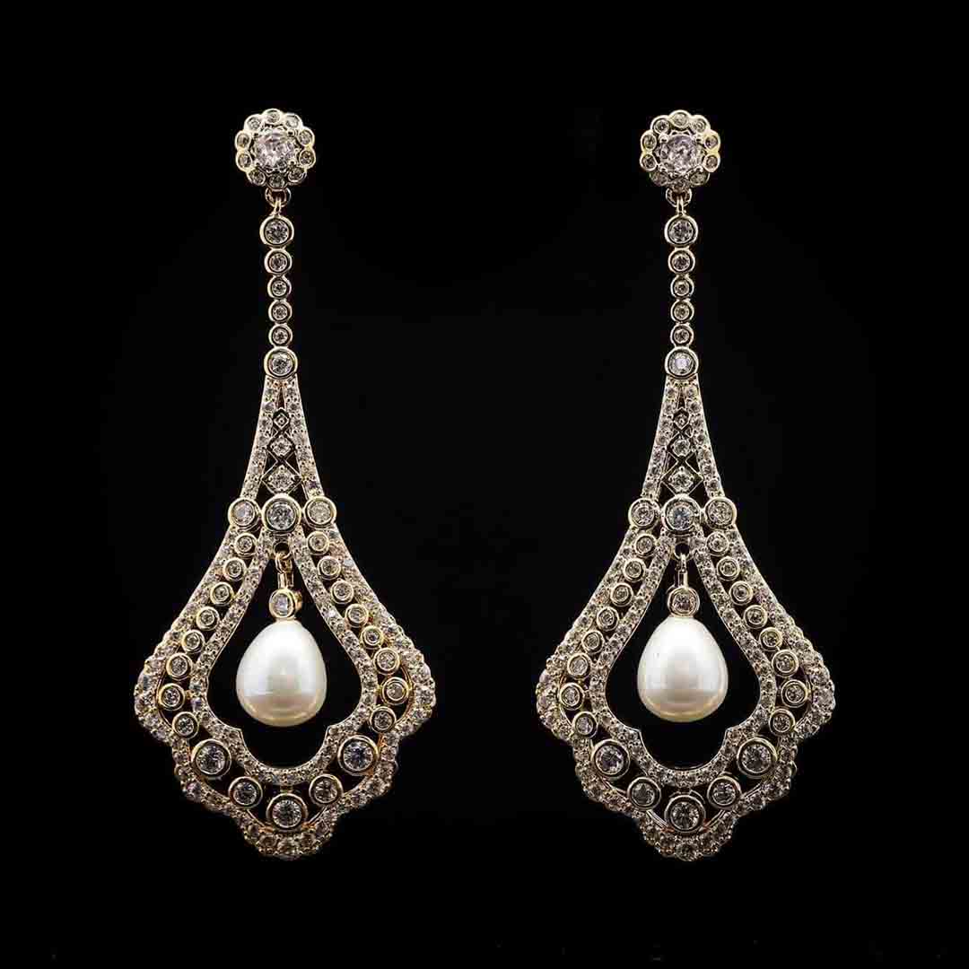 Omnia Golden Teardrop Earrings with High-Quality Zircon Stones and Pearl in Rhodium Plated