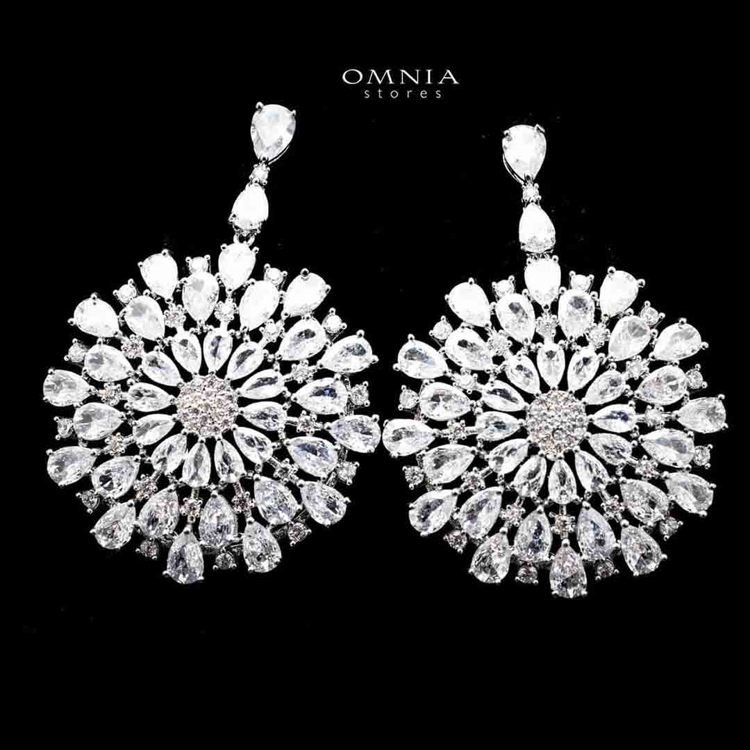 Omnia Inah Sunburst Chandelier Earrings with Pure White Zircon Stone in High Quality Rhodium Plated