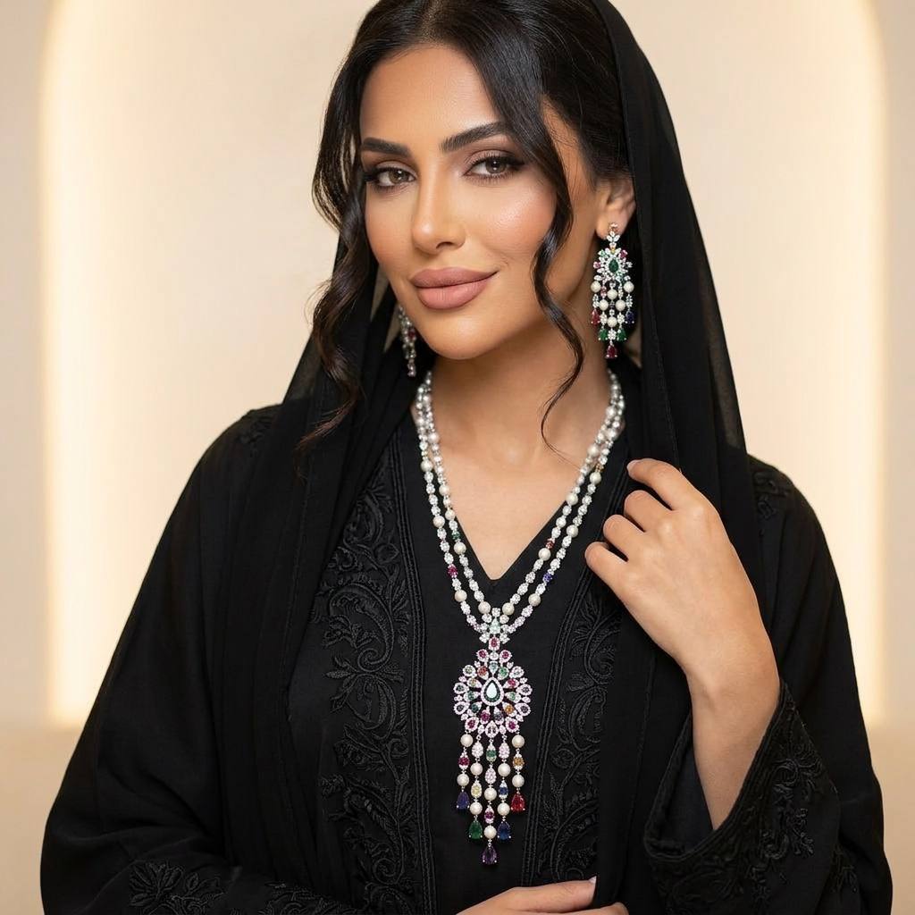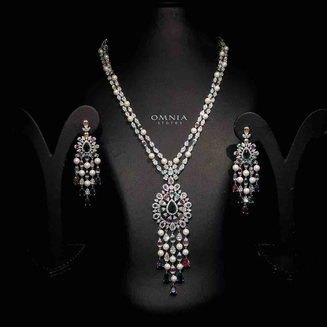 The Omnia Inas White Long Chain Full Set from Omnia Stores has a long chain necklace and beautiful earrings. This set is made of multicolored zircon stones. The stones are embedded in the rhodium plating to make the pieces’ shine perfectly and always classy. Suitable for business occasions, weddings, or any special event, move up your fashion game with this stunning jewelry set, which is now available at Omnia Stores and on the Website.