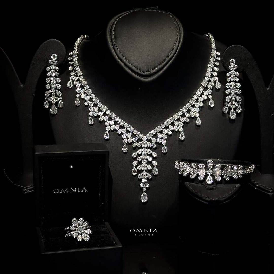 The Omnia Lara Bridal Full Set is designed to complement your bridal look with high-quality zircon stones and a rhodium-plated finish. This complete set includes a necklace, ring, earrings, and bracelet, offering a touch of elegance and sparkle to your special day. Hypoallergenic and tarnish-resistant, it provides both beauty and comfort. Perfect for brides who want to shine with style. Available at Omnia Stores, Dubai and on this website.
