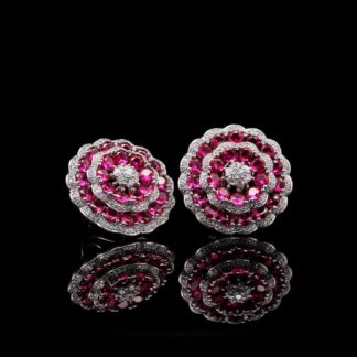 Omnia Floral Halo Earrings with Ruby Red Simulated Diamonds in 92.5 Silver