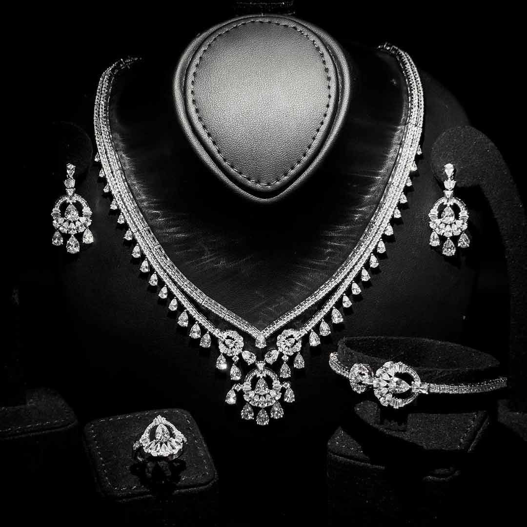 - Bridal Full Set with High-Quality Simulated Diamonds and Teardrop Design in Rhodium Plated