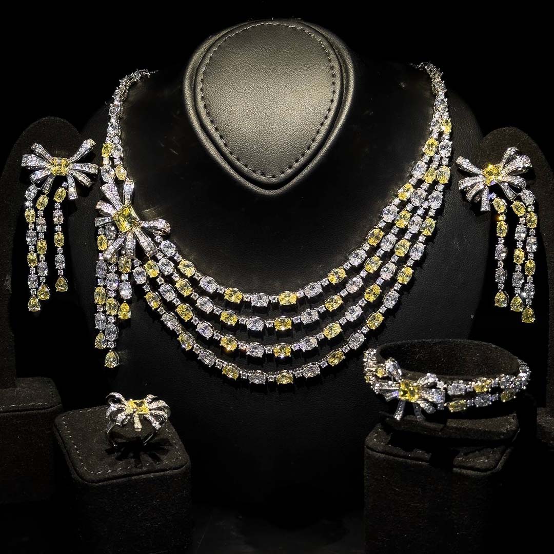 The Omnia Mawada Yellow Bridal Full Set brings a striking touch of color to your bridal look. Featuring high-quality zircon stones and rhodium plating, this set includes a necklace, earrings, ring, and bracelet. The bold yellow hue adds a fresh and unique charm to your special day, while the hypoallergenic and tarnish-resistant materials ensure comfort and durability. Available now at Omnia Stores.
