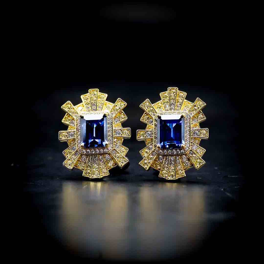 High Quality 92.5 Silver Royal Blue Emerald Cut Sunburst Earrings