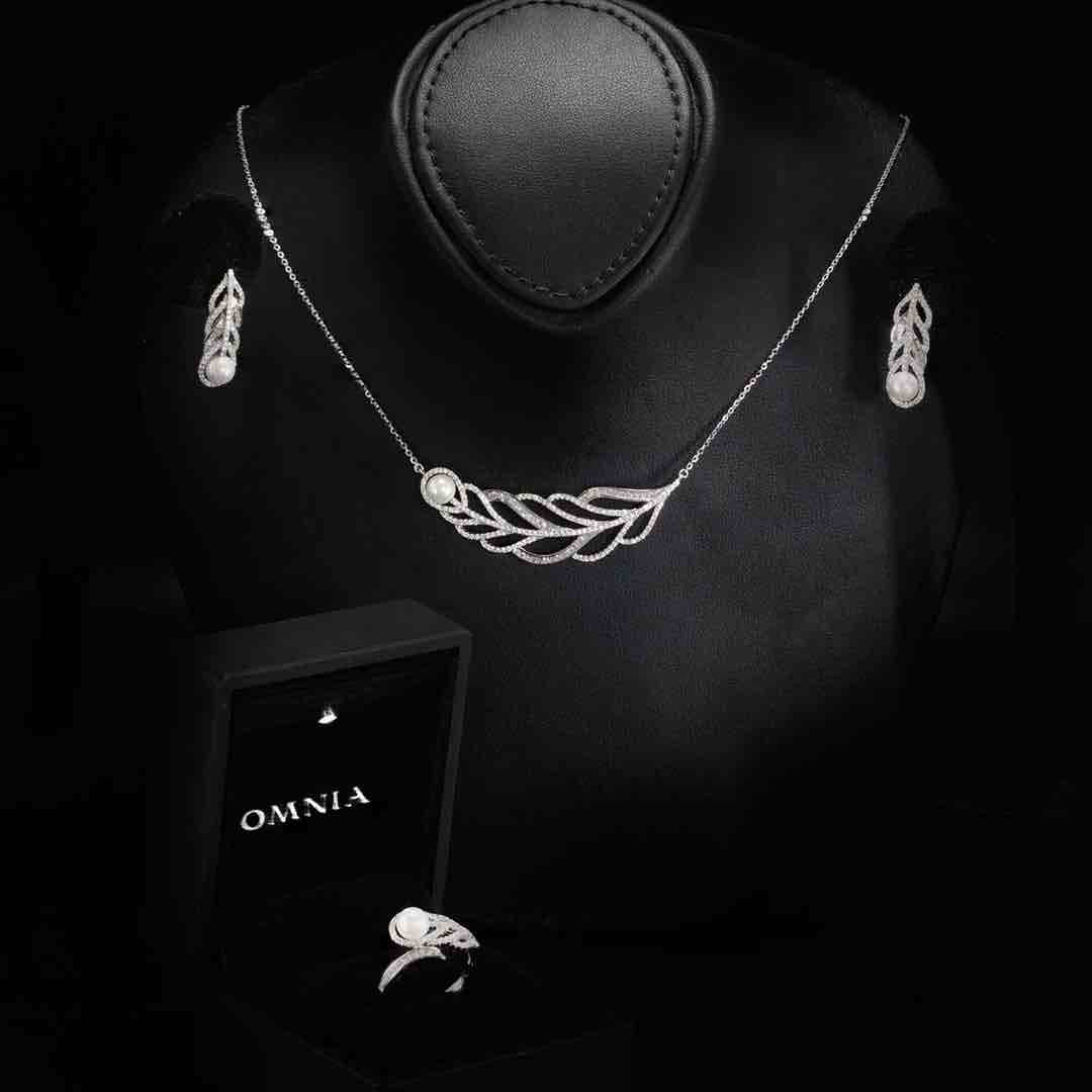 The Omnia Naela White Leaf Pearl Jewelry Set is designed for brides who love sophistication and sparkle. This exquisite 3-piece set includes a necklace, earrings, and ring, crafted in 925 silver and adorned with high-quality simulated diamonds and delicate white leaf-shaped pearls, offering a graceful and radiant finish for your wedding day.