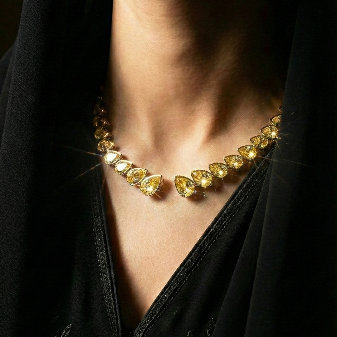 The Omnia Nailah Gold Yellow Necklace is a luxurious and radiant jewelry piece designed to elevate your style with elegance and sophistication. Crafted from premium 925 sterling silver with a stunning gold finish, this necklace features high-quality lab-crafted yellow stones that sparkle brilliantly, reflecting light with every movement. Its bold yet refined design adds a touch of warmth and glamour to any outfit, making it perfect for both festive occasions and special celebrations.