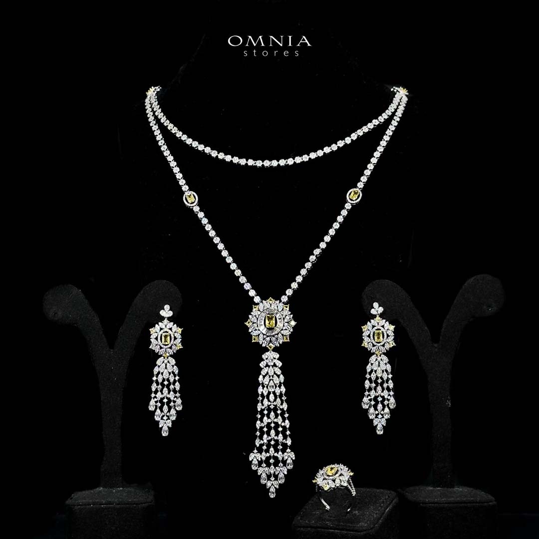 Make a glowing statement on your wedding day with the Omnia Ola Yellow Bridal Long Chain Set, a striking 4-piece bridal collection featuring a long-chain necklace, drop earrings, bracelet, and a matching ring. Infused with vibrant yellow tones, set in high-quality zircon stones, and finished in luxurious rhodium plating, this set is designed for the bride who dares to shine with bold elegance.