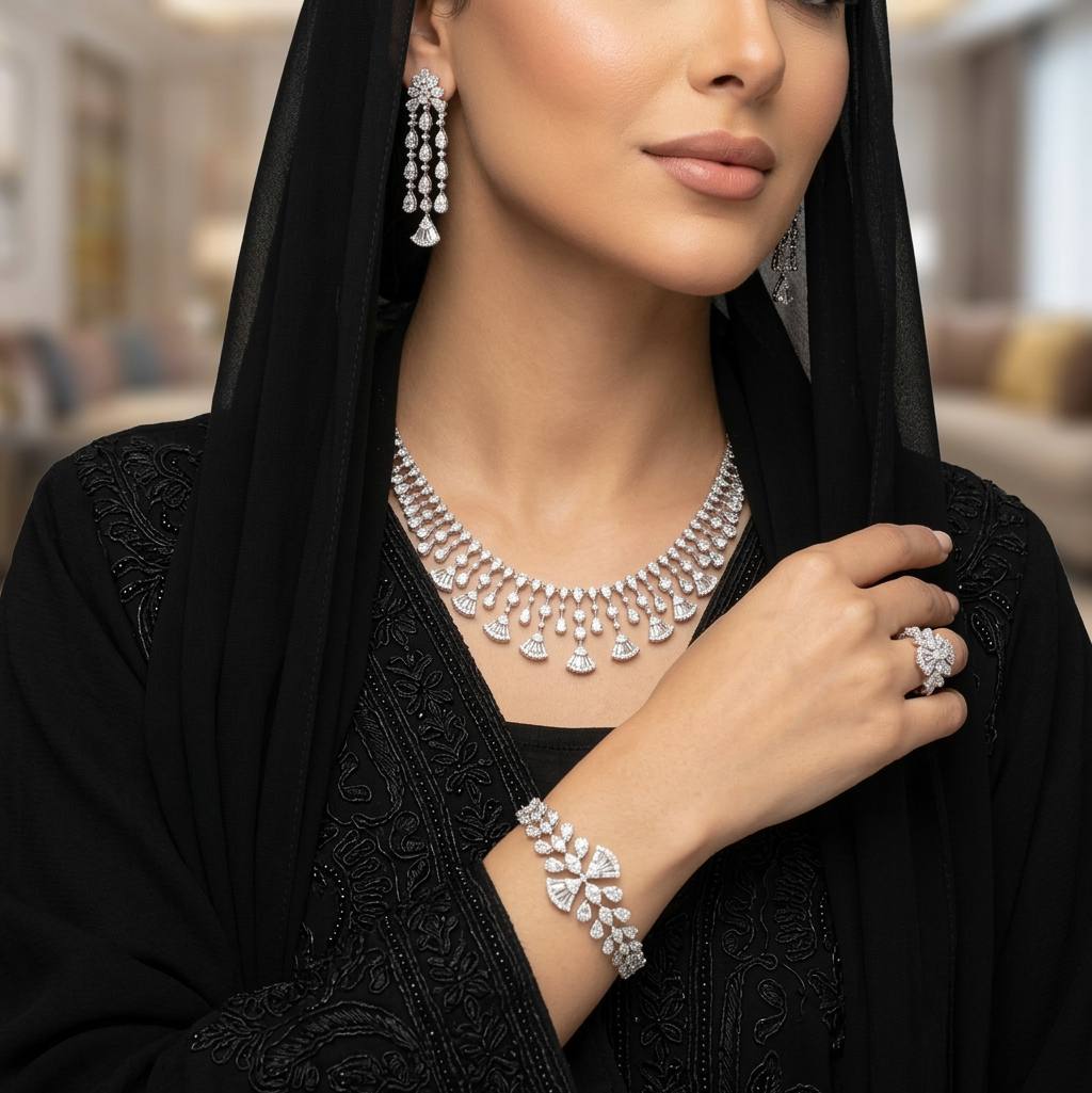 The Rimal White Bridal Set captures the essence of luxury with its sparkling white stones that symbolize purity and grace. Perfectly suited for glamorous weddings in Dubai, royal-inspired celebrations in Saudi Arabia, or elegant receptions across the GCC, this full set ensures you dazzle at every step.