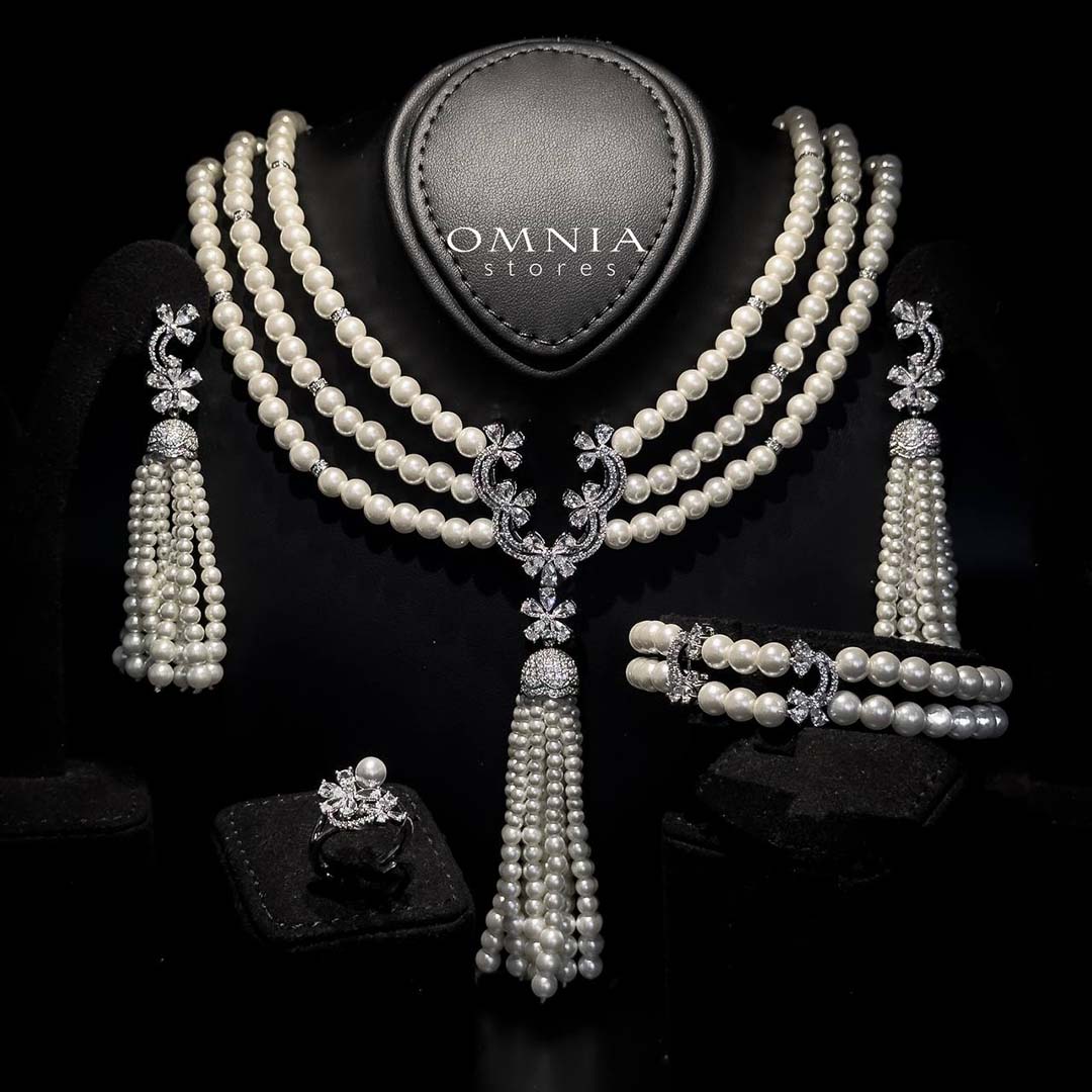 - Pearl Bridal Full Set with Tassel Design and High-Quality Zircon Stones in Rhodium Plated Finish