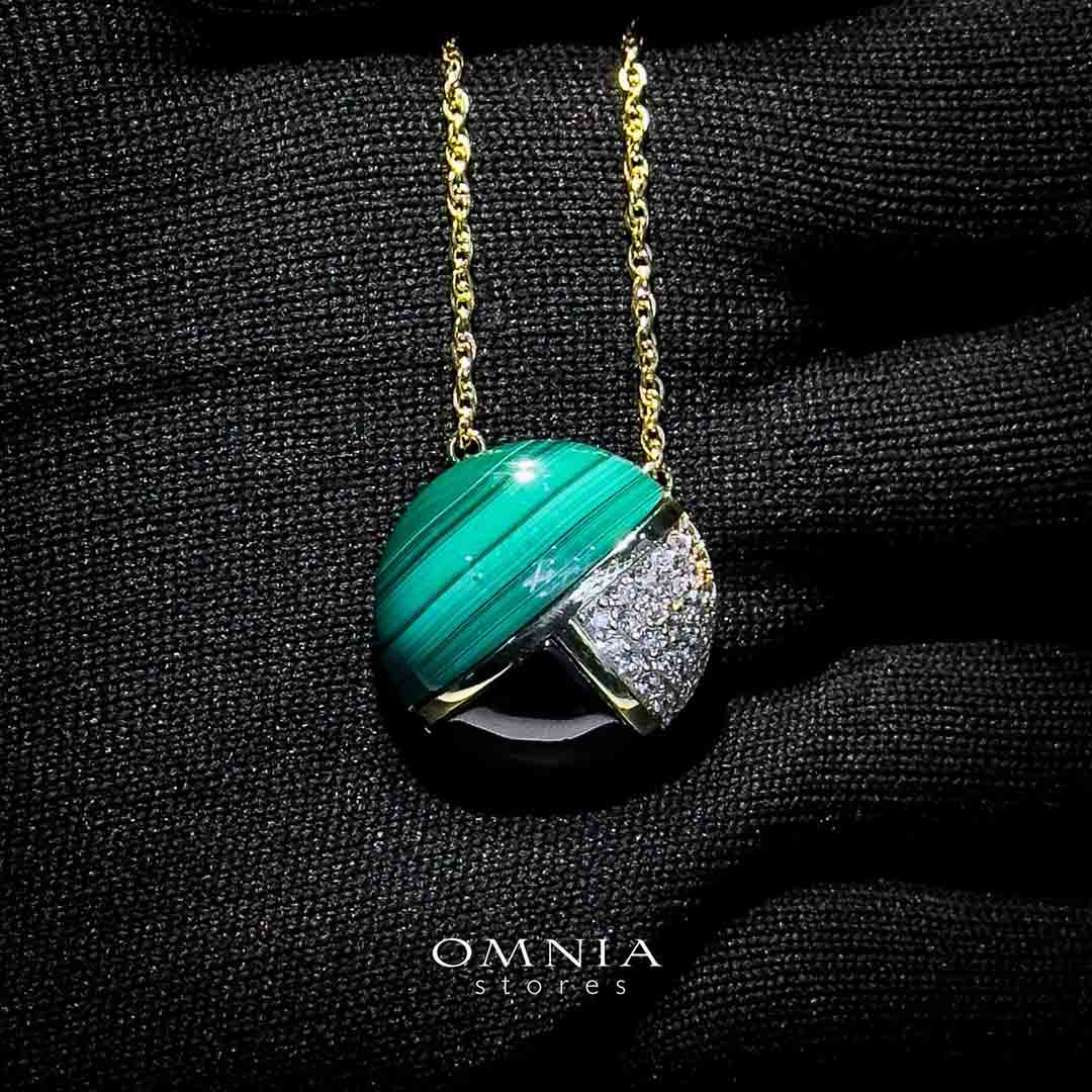 Omnia Selene Malachite and Black Agate Geometric Pendant Necklace with Zircon Accents in 92.5 Silver and Brass with Gold Plated Finish