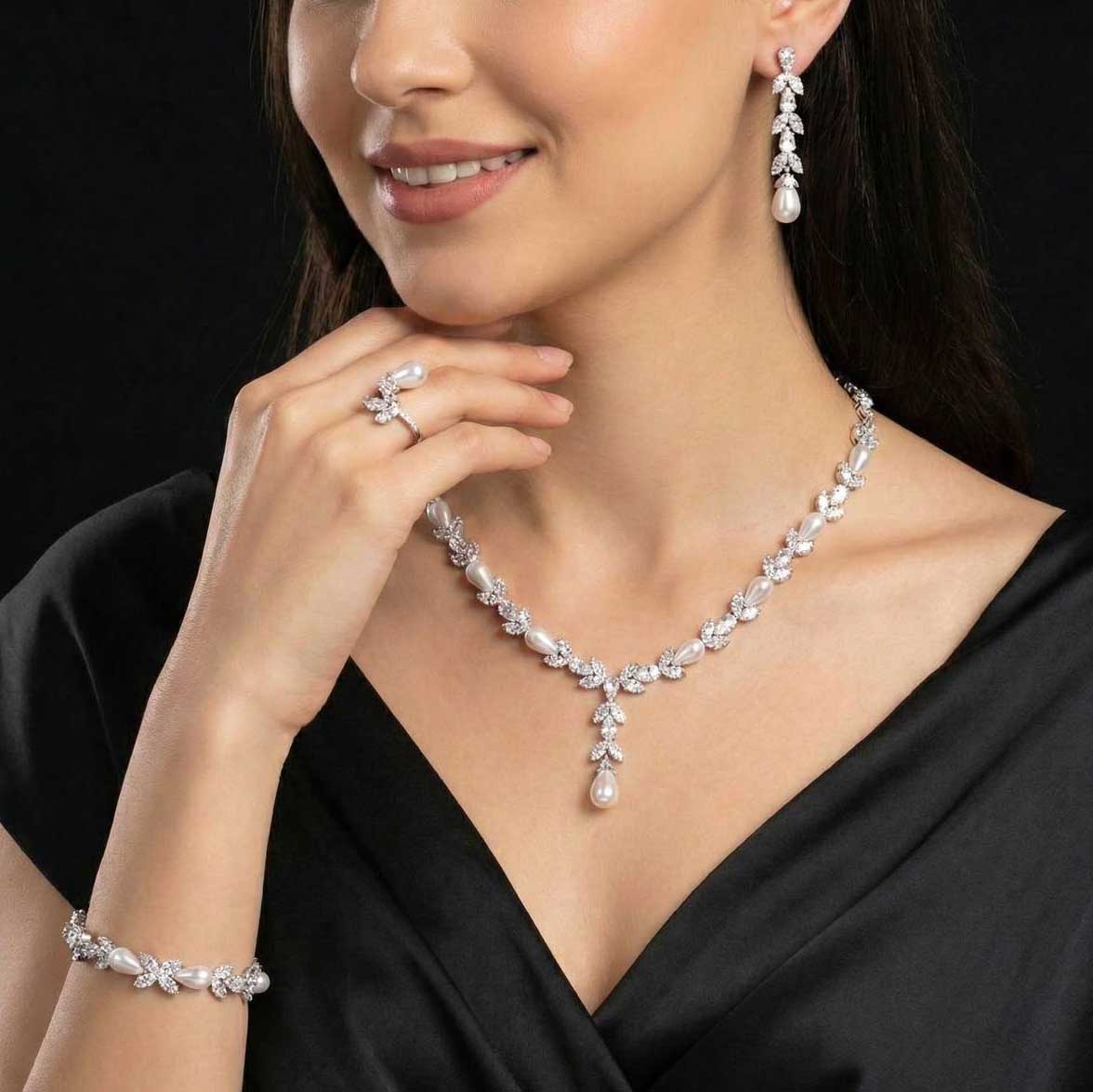 The carefully selected zircon stones are precision-cut to deliver exceptional sparkle and clarity, beautifully complementing the natural elegance of the pearls. Finished with premium rhodium plating, the set offers a long-lasting, high-shine finish that resists tarnishing and maintains its brilliance even with extended wear—perfect for GCC weather conditions.