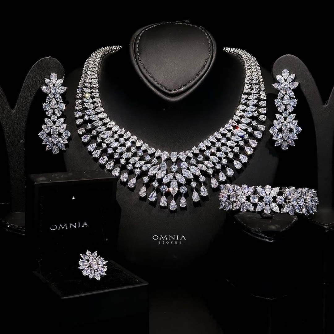 Experience glamour in every detail with Omnia Sherine Bridal Simulated Diamonds Set. This exquisite set includes necklace, earrings, bracelet, and ring, all crafted with high-quality simulated diamonds. Designed with precision and elegance, each piece is set in polished rhodium plating. Whether for your wedding day or an elegant evening event, this set is perfect to elevate your look.