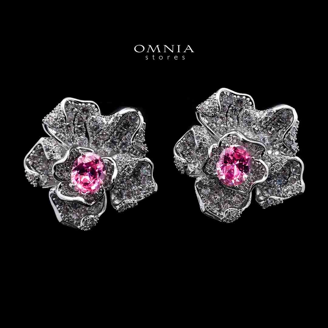 Omnia Silver Floral Stud Earrings with Oval-Cut Pink Center Stone & Pave-Set Simulated Diamonds