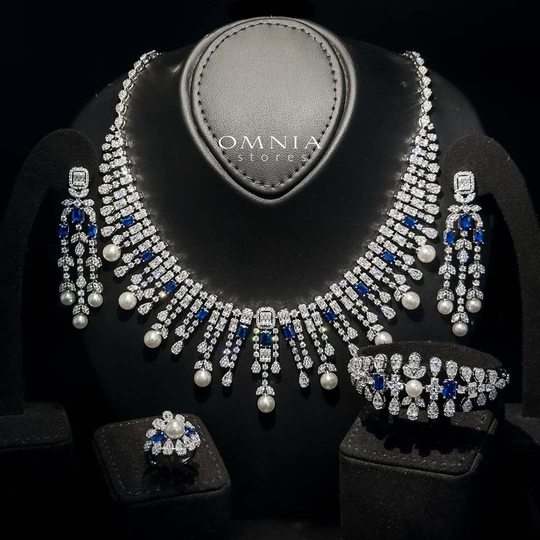 Omnia Sirella Blue Bridal Full Set with Intricate Cascading Zircon and Pearl Design in High-Quality Rhodium Plated