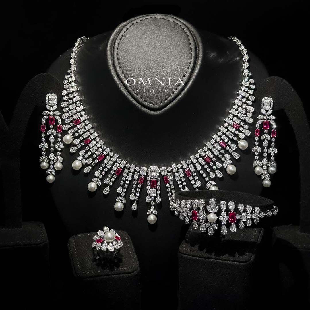 Omnia Sirella Maroon Bridal Full Set with Intricate Cascading Zircon and Pearl Design in High-Quality Rhodium Plated