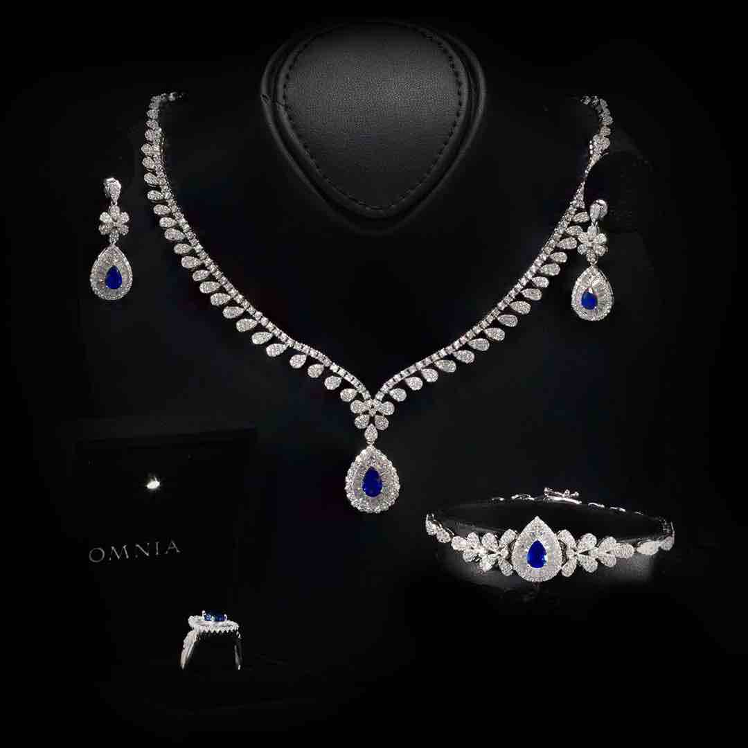 Add a touch of regal charm to your bridal look with the Omnia Sophia Blue Teardrop Bridal Full Set, designed for brides in the UAE, Saudi Arabia, Kuwait, and the GCC who desire a unique yet timeless sparkle. Crafted in 925 sterling silver and adorned with brilliant high-quality simulated diamonds paired with a striking blue teardrop centerpiece, this set radiates elegance, sophistication, and royal allure.