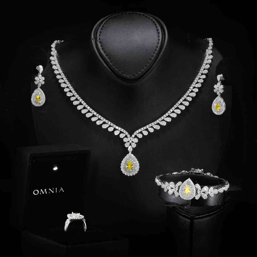 Radiate joy and elegance with the Omnia Sophia Yellow Teardrop Bridal Full Set, designed for brides in the UAE, Saudi Arabia, Kuwait, and the GCC who want to shine with a vibrant yet timeless sparkle. Handcrafted in 925 sterling silver and adorned with high-quality simulated diamonds alongside a luminous yellow teardrop centerpiece, this set symbolizes happiness, prosperity, and everlasting love.