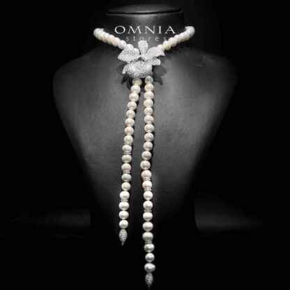 Omnia Stella Floral Design Long Chain Necklace in 925 Silver with High-Quality Simulated Diamonds