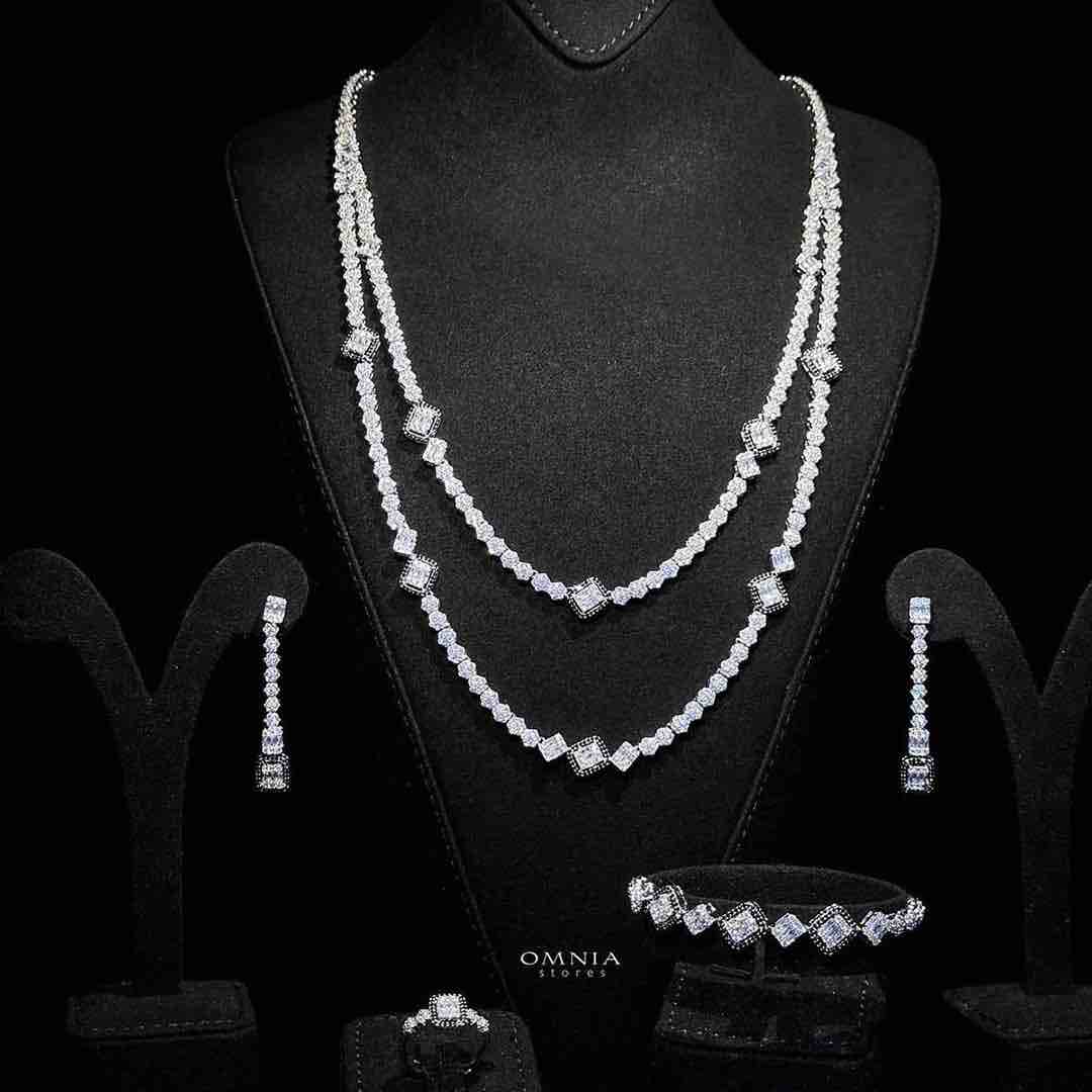 The Omni Thekra Bridal Black & White Long Chain Set will make your special day memorable. This beautiful jewelry set consists of a necklace, a long double chain with black and white zircon stones, earrings, a ring, and a bracelet plated with Rhodium. For brides or any other formal outfit, this Set gives a glowing look and enhances every attire’s beauty. This Set is available in Omnia Stores. You can buy it online or order it from Omnia Stores’ website.