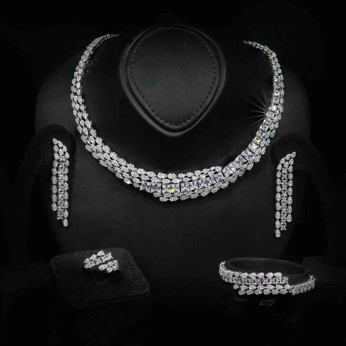 Expertly finished with high quality zircon stones, each piece is carefully designed to deliver exceptional brilliance, clarity, and a radiant diamond-like sparkle. The stones are precision-cut to reflect light beautifully, creating an eye-catching shimmer that enhances bridal and formal looks effortlessly.