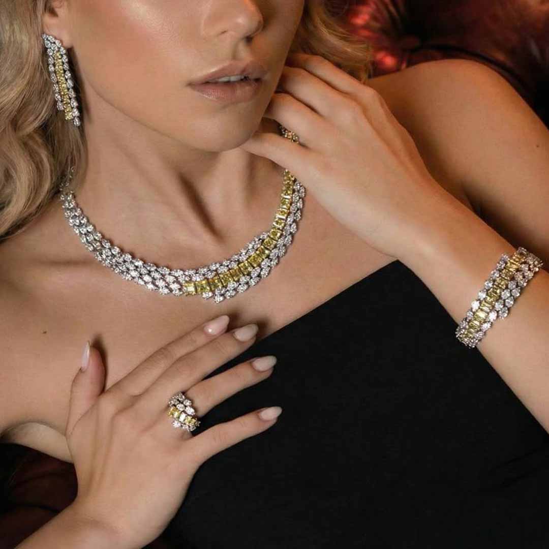 Adorned with high quality yellow zircon stones, each stone is expertly cut to deliver exceptional brilliance, clarity, and a captivating diamond-like sparkle. The rich yellow tones symbolize joy, prosperity, and celebration, making this set an exquisite choice for weddings, engagements, nikah ceremonies, and grand receptions.