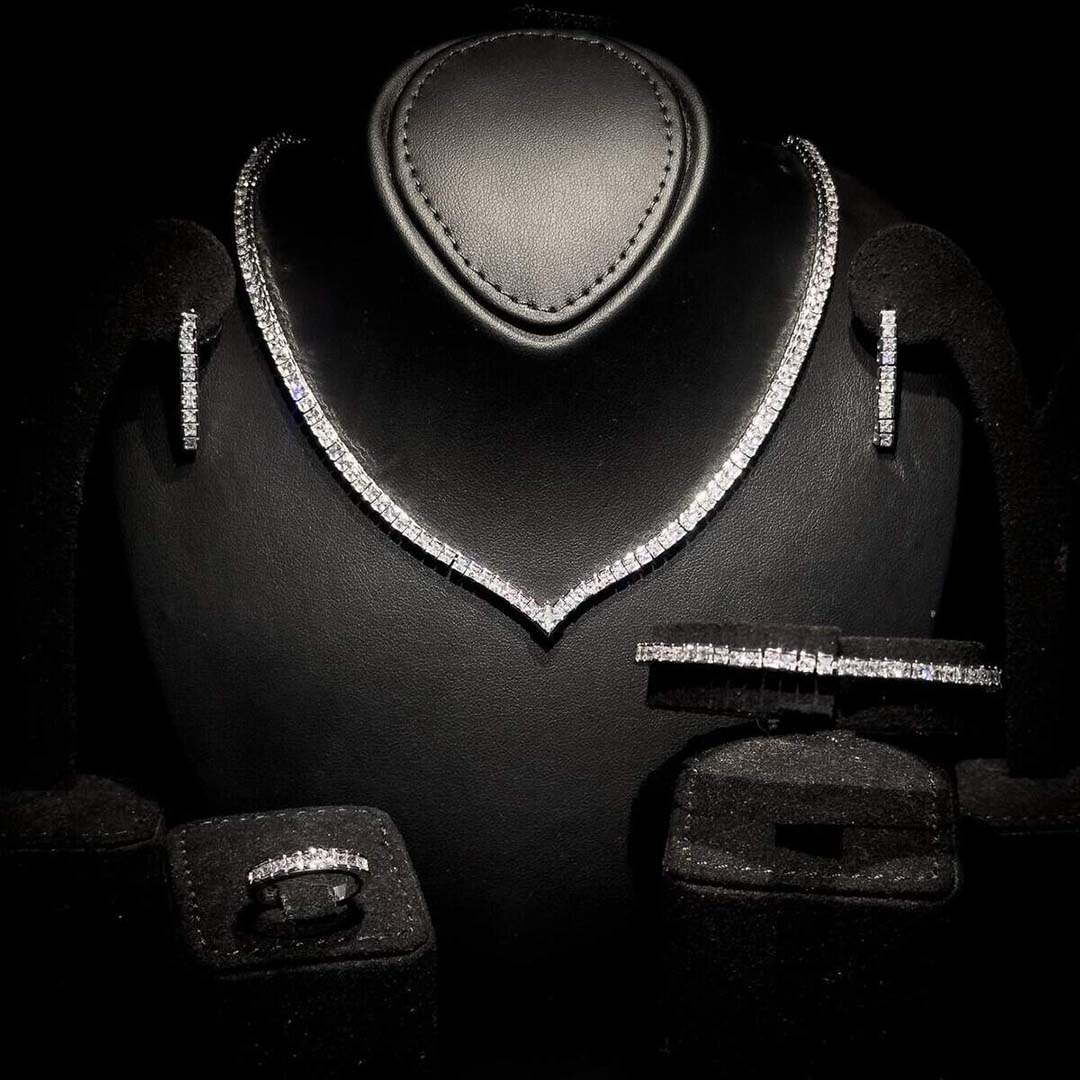 The Omnia Mona White Set is perfect for adding a touch of sparkle to your outfit. This set features high-quality zircon stones and a rhodium-plated finish, offering a complete set of earrings, a necklace, ring and a bracelet. Hypoallergenic and tarnish-free, it provides lasting shine and comfort for your most special occasions. Find this exclusive set only at Omnia Stores, Dubai and also online on this website.