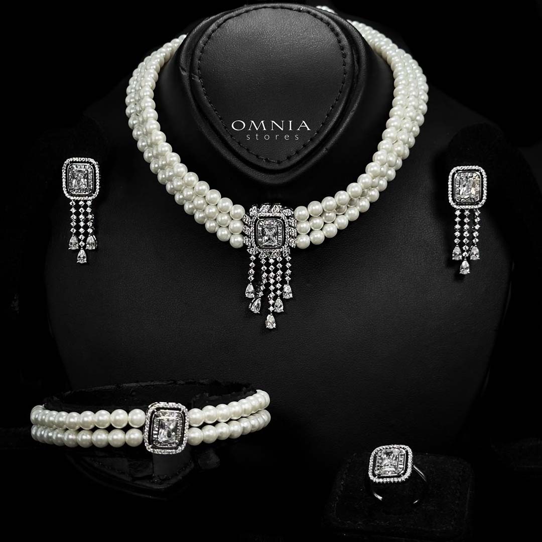 Celebrate your once-in-a-lifetime moments with the Omnia Wahida Pearl Bridal Set, an exquisite full set that includes a necklace (adjustable 35–39 cm), earrings, and ring—each rhodium-plated in lustrous gold and delicately adorned with high-quality pearls and zircon stones. The result is a look that balances purity, sparkle, and timeless grace.