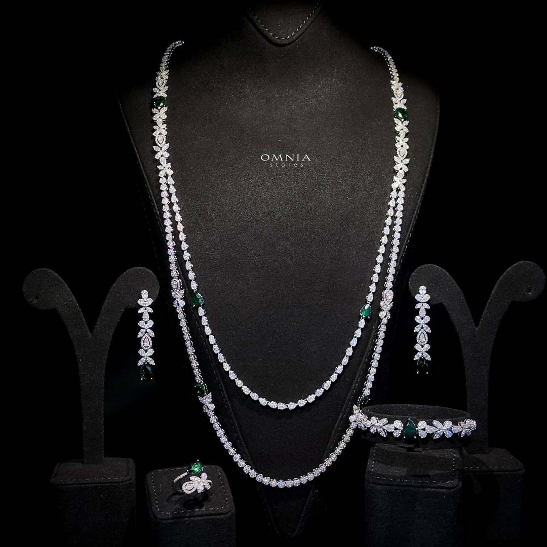 Omnia Yaza Bridal Green Long Chain Set – High-Quality Zircon Stones in Rhodium Plated