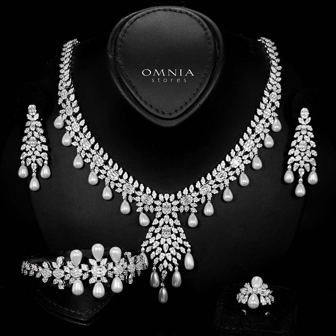 Omnia Zahrah Pearl Luxury Bridal White Pearl Full Set in High Quality Zircon Stone Rhodium Plated
