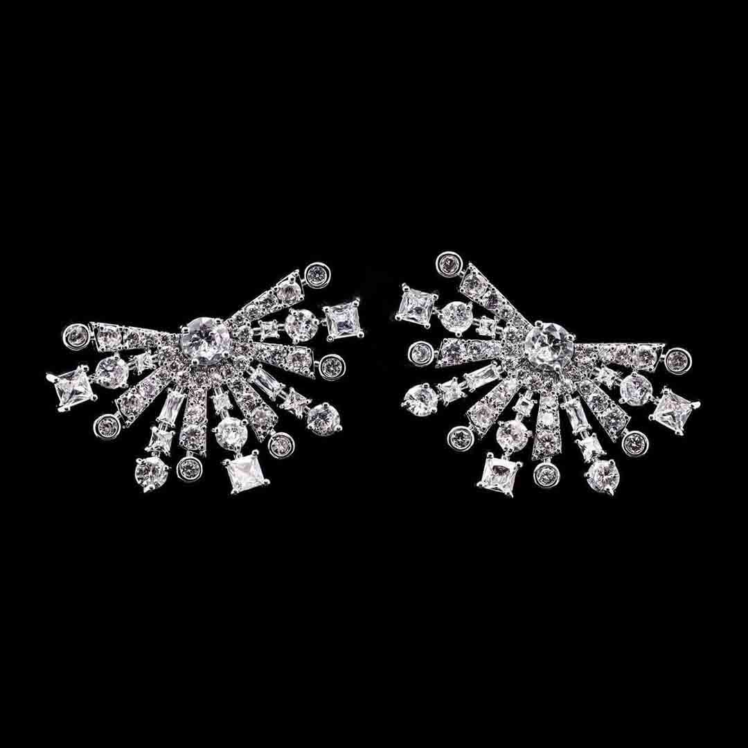 Omnia Zara Radiant Fan Design Earrings with White Zircon Stones in High-Quality Rhodium Plated
