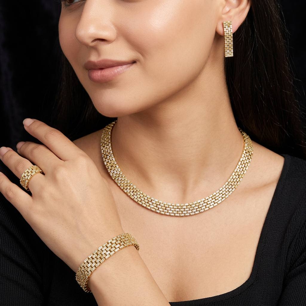 Introducing the Omnia Zehra Bridal Full Set, a masterpiece of bridal elegance that blends the richness of gold plating with the brilliance of rhodium finish—all adorned with high-quality zircon stones that mimic the sparkle of real diamonds. This luxurious 4-piece set includes a necklace, bracelet, earrings, and ring, designed to enhance your bridal beauty with regal charm and timeless sophistication.